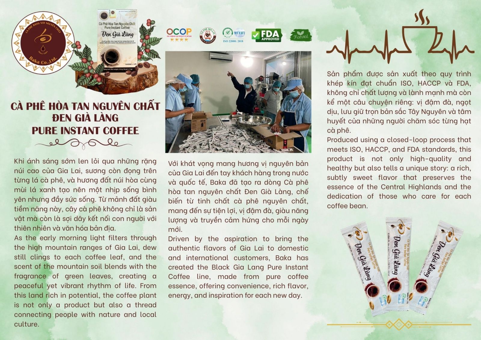 Khi ánh sáng sớm len lỏi qua những rặng núi cao của Gia Lai, sương còn đọng trên từng lá cà phê, và hương đất núi hòa cùng mùi lá xanh tạo nên một nhịp sống bình yên nhưng đầy sức sống. Từ mảnh đất giàu tiềm năng này, cây cà phê không chỉ là sản vật mà còn là sợi dây kết nối con người với thiên nhiên và văn hóa bản địa. Với khát vọng mang hương vị nguyên bản của Gia Lai đến tay khách hàng trong nước và quốc tế, Baka đã tạo ra dòng Cà phê hòa tan nguyên chất Đen Già Làng, chế biến từ tinh chất cà phê nguyên chất, mang đến sự tiện lợi, vị đậm đà, giàu năng lượng và truyền cảm hứng cho mỗi ngày mới. Sản phẩm được sản xuất theo quy trình khép kín đạt chuẩn ISO, HACCP và FDA, không chỉ chất lượng và lành mạnh mà còn kể một câu chuyện riêng: vị đậm đà, ngọt dịu, lưu giữ trọn bản sắc Tây Nguyên và tâm huyết của những người chăm sóc từng hạt cà phê.