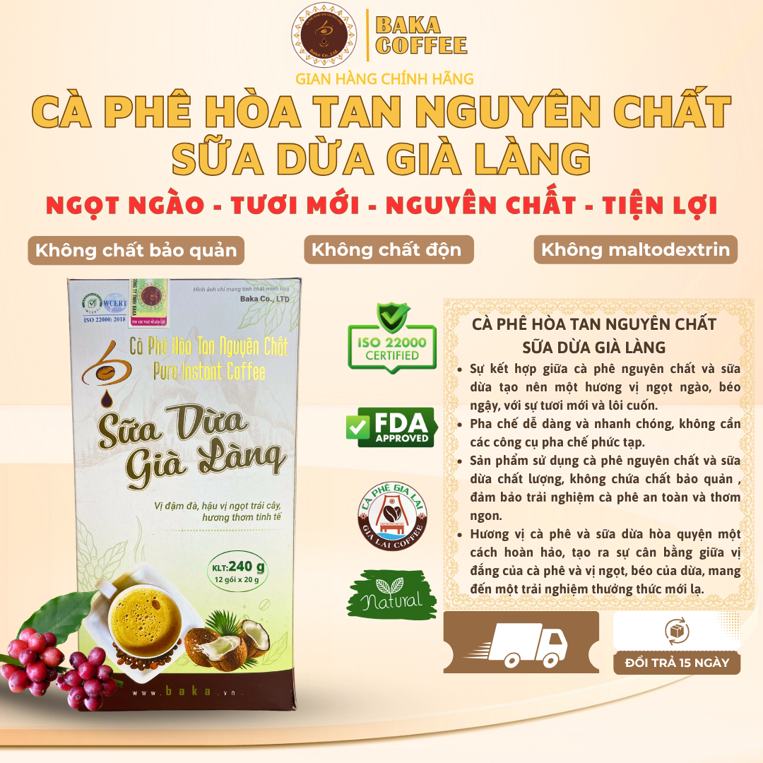 Cà Phê Hòa Tan Nguyên Chất SỮA DỪA GIÀ LÀNG - Hộp 12 GÓI