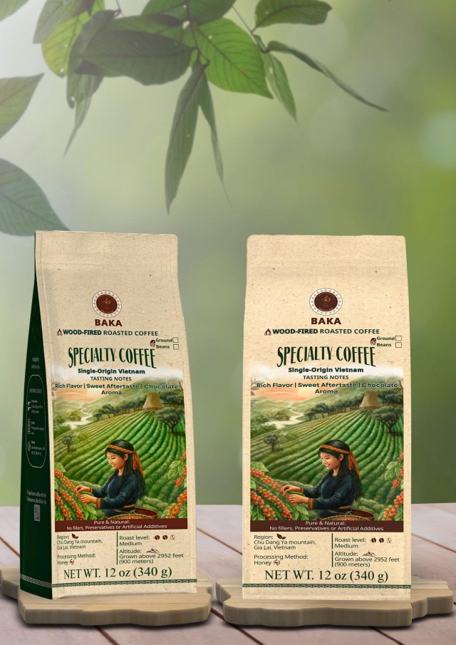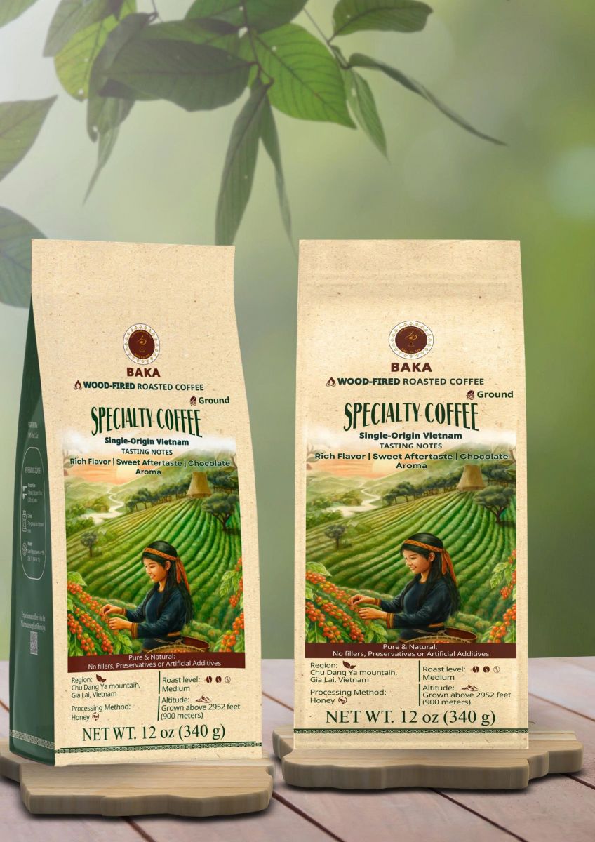 Bao bì được thiết kế tối giản, khắc họa hình ảnh núi đồi Chu Đăng Ya và người nông dân, thể hiện triết lý của BAKA: Chân thật, Mộc mạc, và theo đuổi Giá trị Bền vững trong từng công đoạn sản xuất.