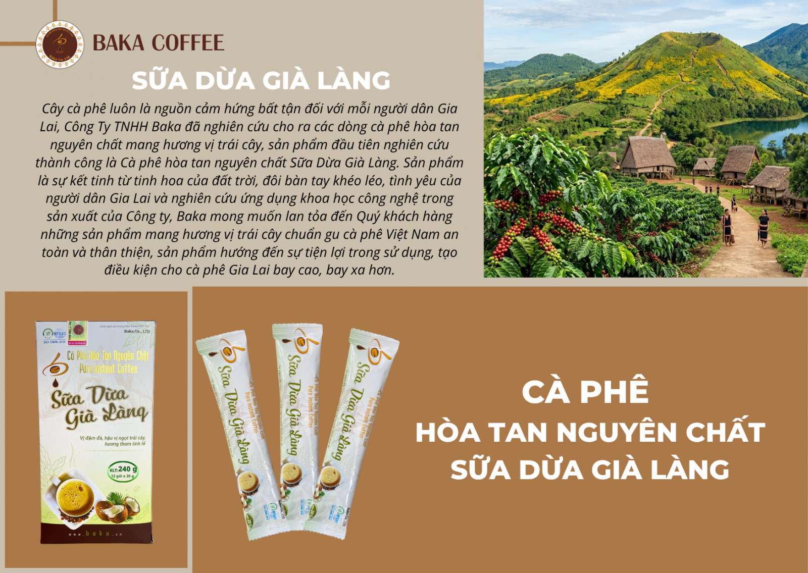 Cây cà phê luôn là nguồn cảm hứng bất tận đối với mỗi người dân Gia Lai, Công Ty TNHH Baka đã nghiên cứu cho ra các dòng cà phê hòa tan nguyên chất mang hương vị trái cây, sản phẩm đầu tiên nghiên cứu thành công là Cà phê hòa tan nguyên chất Sữa Dừa Già Làng.
