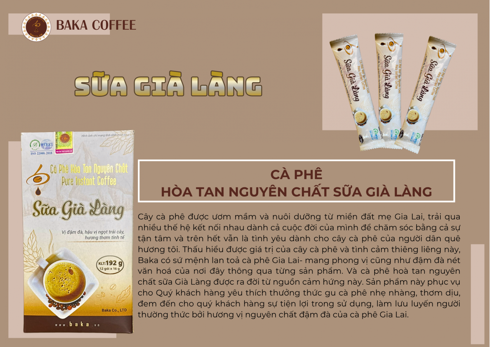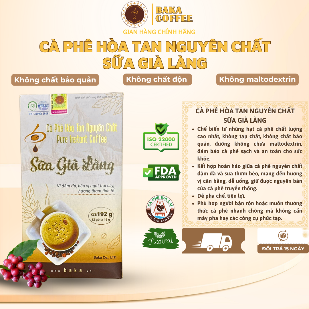 Cây cà phê được ươm mầm và nuôi dưỡng từ miền đất mẹ Gia Lai, trải qua nhiều thế hệ kết nối nhau dành cả cuộc đời của mình để chăm sóc bằng cả sự tận tâm và trên hết vẫn là tình yêu dành cho cây cà phê của người dân quê hương tôi. Thấu hiểu được giá trị của cây cà phê và tình cảm thiêng liêng này, Baka có sứ mệnh lan toả cà phê Gia Lai- mang phong vị cũng như đậm đà nét văn hoá của nơi đây thông qua từng sản phẩm. Và cà phê hoà tan nguyên chất sữa Già Làng được ra đời từ nguồn cảm hứng này. Sản phẩm này phục vụ cho Quý khách hàng yêu thích thưởng thức gu cà phê nhẹ nhàng, thơm dịu, đem đến cho quý khách hàng sự tiện lợi trong sử dụng, làm lưu luyến người thường thức bởi hương vị nguyên chất đậm đà của cà phê Gia Lai.