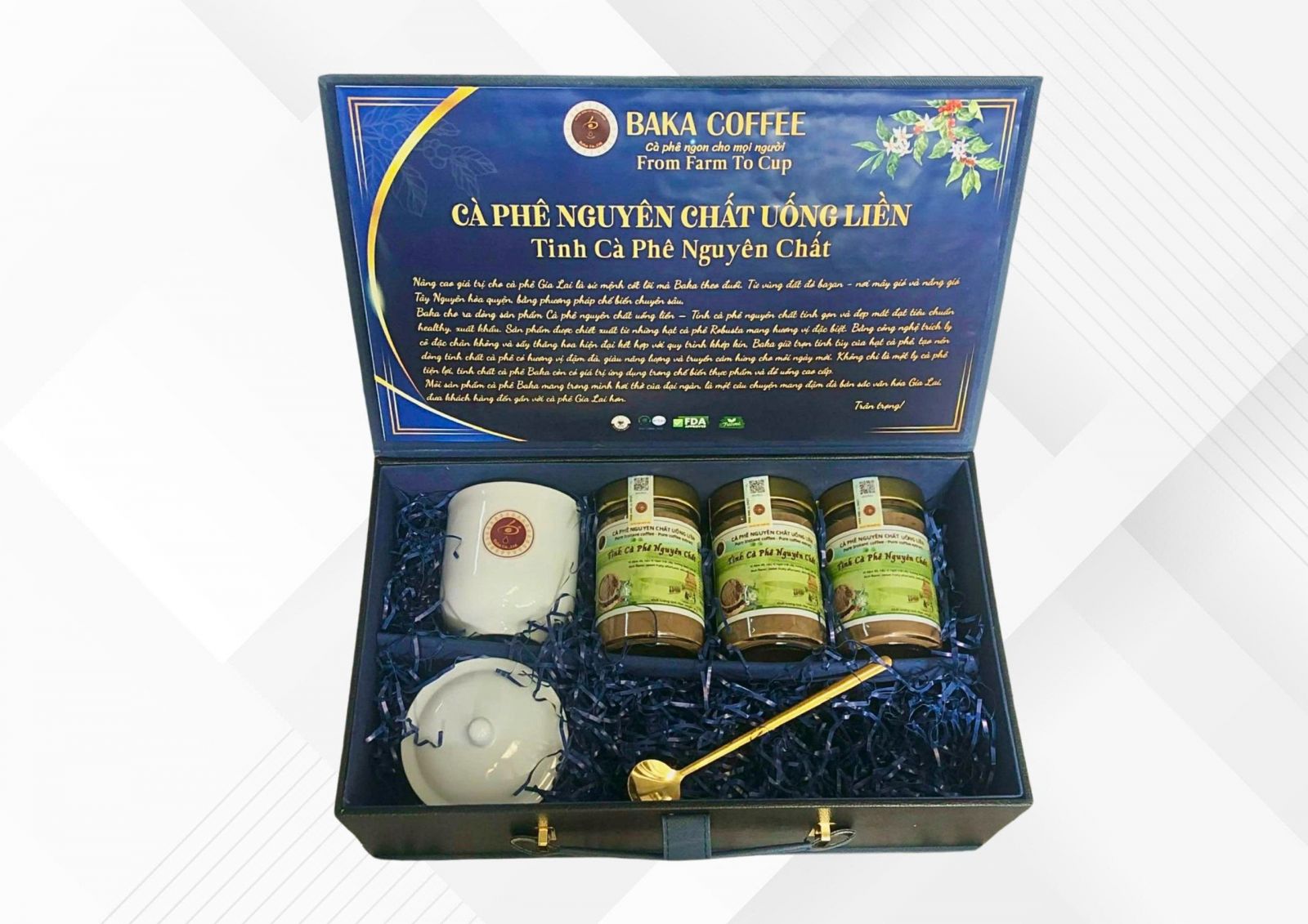 Nâng cao giá trị cho cà phê Gia Lai là sứ mệnh cốt lõi mà Baka theo đuổi. Từ vùng đất đỏ bazan - nơi mây gió và nắng gió Tây Nguyên hòa quyện, bằng phương pháp chế biến chuyên sâu, Baka cho ra dòng sản phẩm Cà phê nguyên chất uống liền – Tinh cà phê nguyên chất tinh gọn và đẹp mắt đạt tiêu chuẩn healthy, xuất khẩu. Sản phẩm được chiết xuất từ những hạt cà phê Robusta mang hương vị đặc biệt. Bằng công nghệ trích ly cô đặc chân không và sấy thăng hoa hiện đại kết hợp với quy trình khép kín, Baka giữ trọn tinh túy của hạt cà phê, tạo nên dòng tinh chất cà phê có hương vị đậm đà, giàu năng lượng và truyền cảm hứng cho môi ngày mới.Không chỉ là một ly cà phê tiện lợi, tinh chất cà phê Baka còn có giá trị ứng dụng trong chế biến thực phẩm và đồ uống cao cấp. Môi sản phẩm cà phê Baka mang trong mình hơi thở của đại ngàn, là một câu chuyện mang đậm đà bản sắc văn hóa Gia Lai, đưa khách hàng đến gần với cà phê Gia Lai hơn.